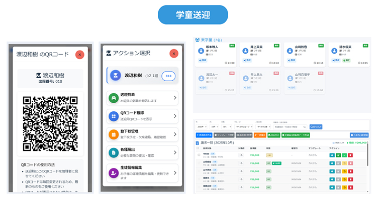 QRコードによる登下校管理から保護者連絡・請求管理まで一元化。学童保育や習い事教室の運営をサポートします。