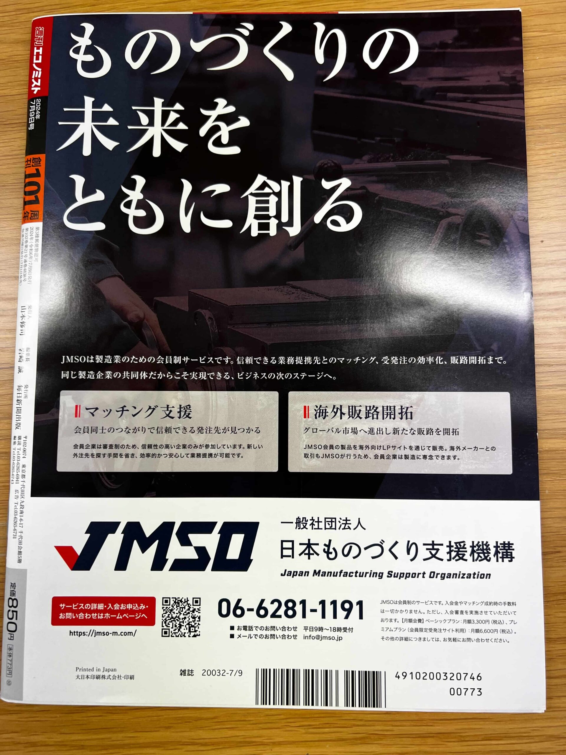 2024年7月9日(火)の週間エコノミストにて、日本ものづくり支援機構(JMSO)の広告が裏表紙一面に大きく掲載されました。